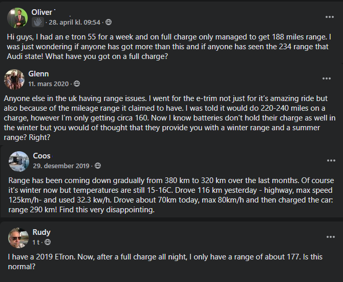 Below you see the range of the different current and some future Audi models. The range is from 341km (211 miles) to 700km (435 miles) according to the WLTP combined standard.