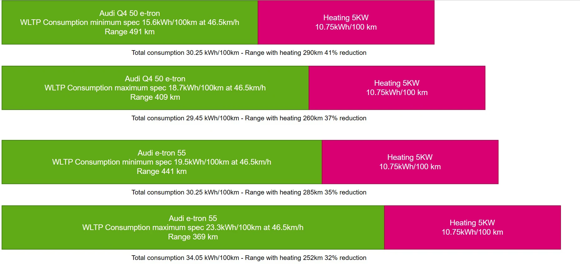 How 5KW heating affect range on Audi Q4 50 e-tron and Audi e-tron 55