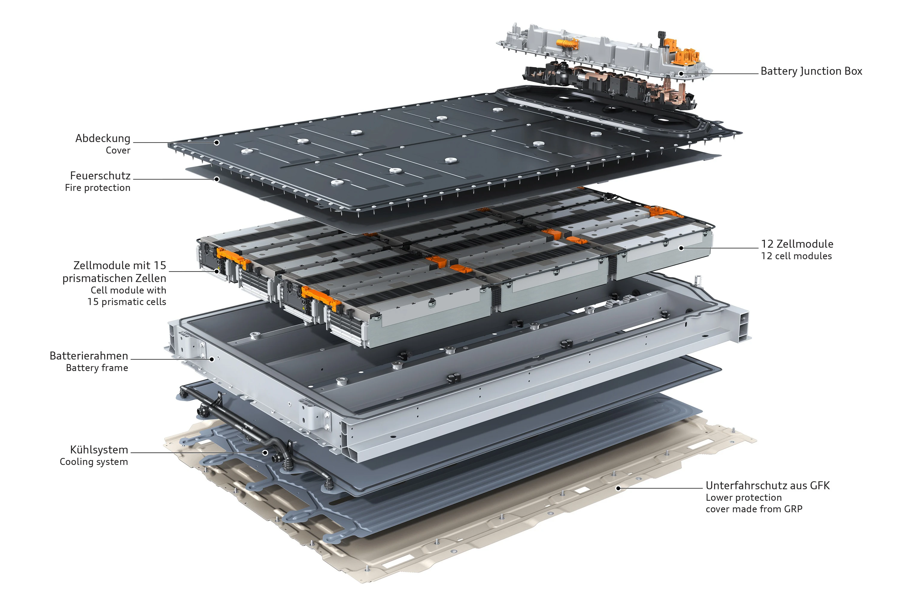 A variant with a capacity of 83 kWh is also available for the Audi A6 e-tron series. The latter consists of ten modules and 150 cells. Thanks to optimized cell chemistry and high-performance thermal management, the 100 kWh battery can be charged from 10 to 80 percent in 21 minutes at a suitable fast-charging station. Recharging a range up to 255 kilometers (158 mi) is possible in only ten minutes.
