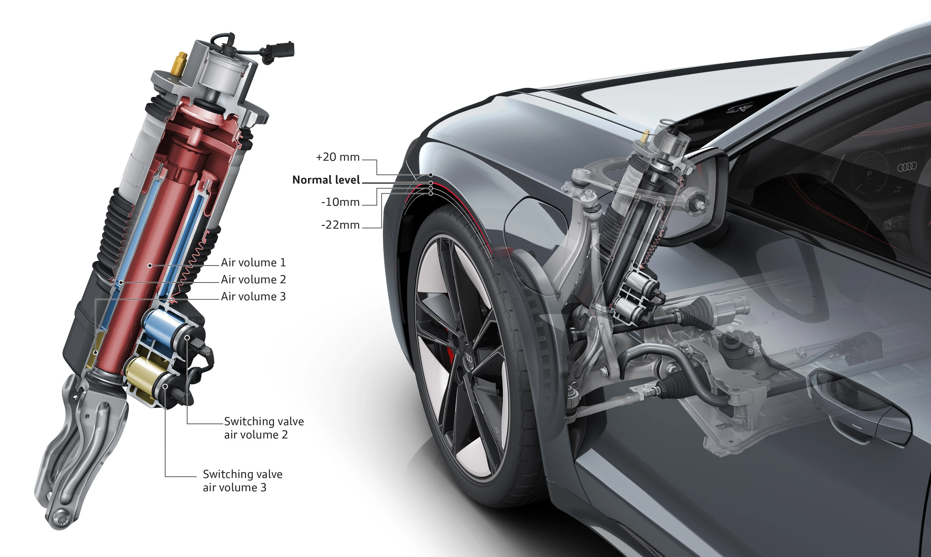 While the adaptive air suspension is optional in the Audi e-tron GT quattro, it comes as standard in the RS model. Its compressor generates a working pressure of up to 19 bar, and the three-chamber air suspension on the front and rear axles enables comfortable basic suspension. The chambers in the bellows are activated and deactivated depending on the driving situation. During smooth driving, all three of them contribute to the suspension, while only one or two chambers are active in the case of dynamic requirements such as heavy braking or high transverse acceleration – this strategy reduces the movement of the body.