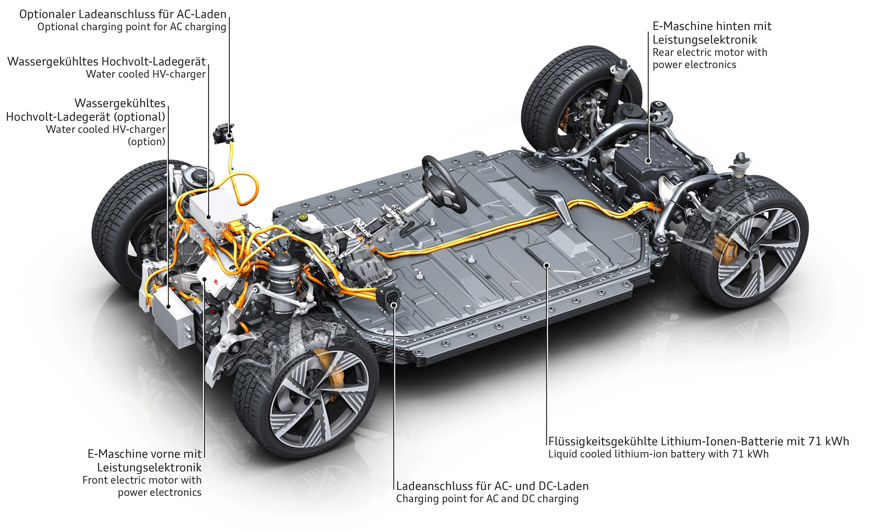 For both e-tron 50 and e-tron 55 Audi uses the AKA320 drive unit for the rear. This is a drive unit with 314nm torque (355nm with boost on e-tron 55) and it has a coaxial configuration on the axels (axels goes through the unit)