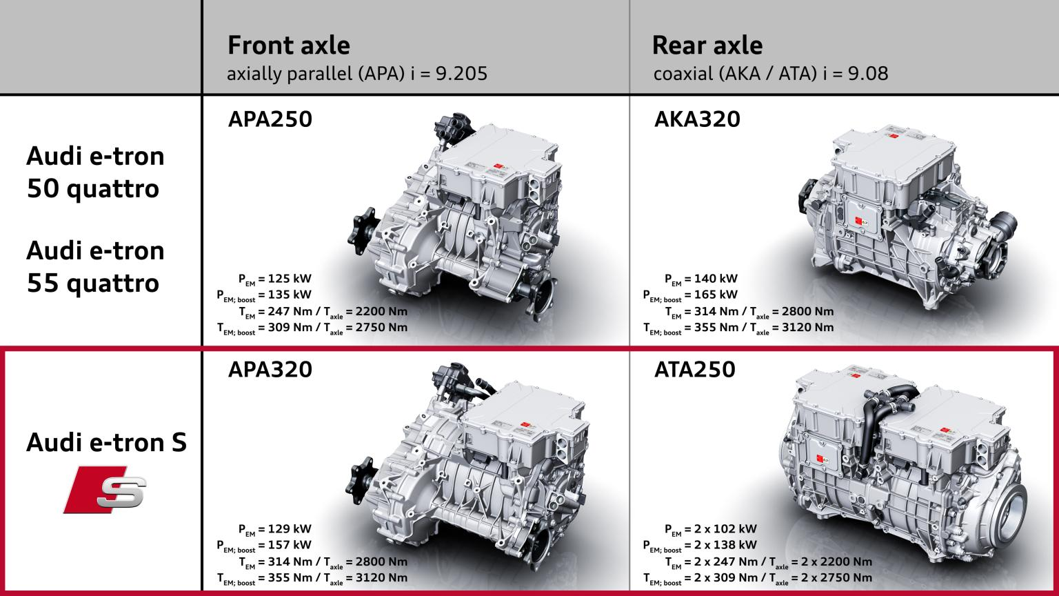 On e-tron 50 on e-tron 55 they have the 250 in front with a parallel (APA250) axle and the 320 rear with coaxial axle (ATA320). In e-tron S they have the 320 in front (APA320) and two 250 in the back (ATA250)
