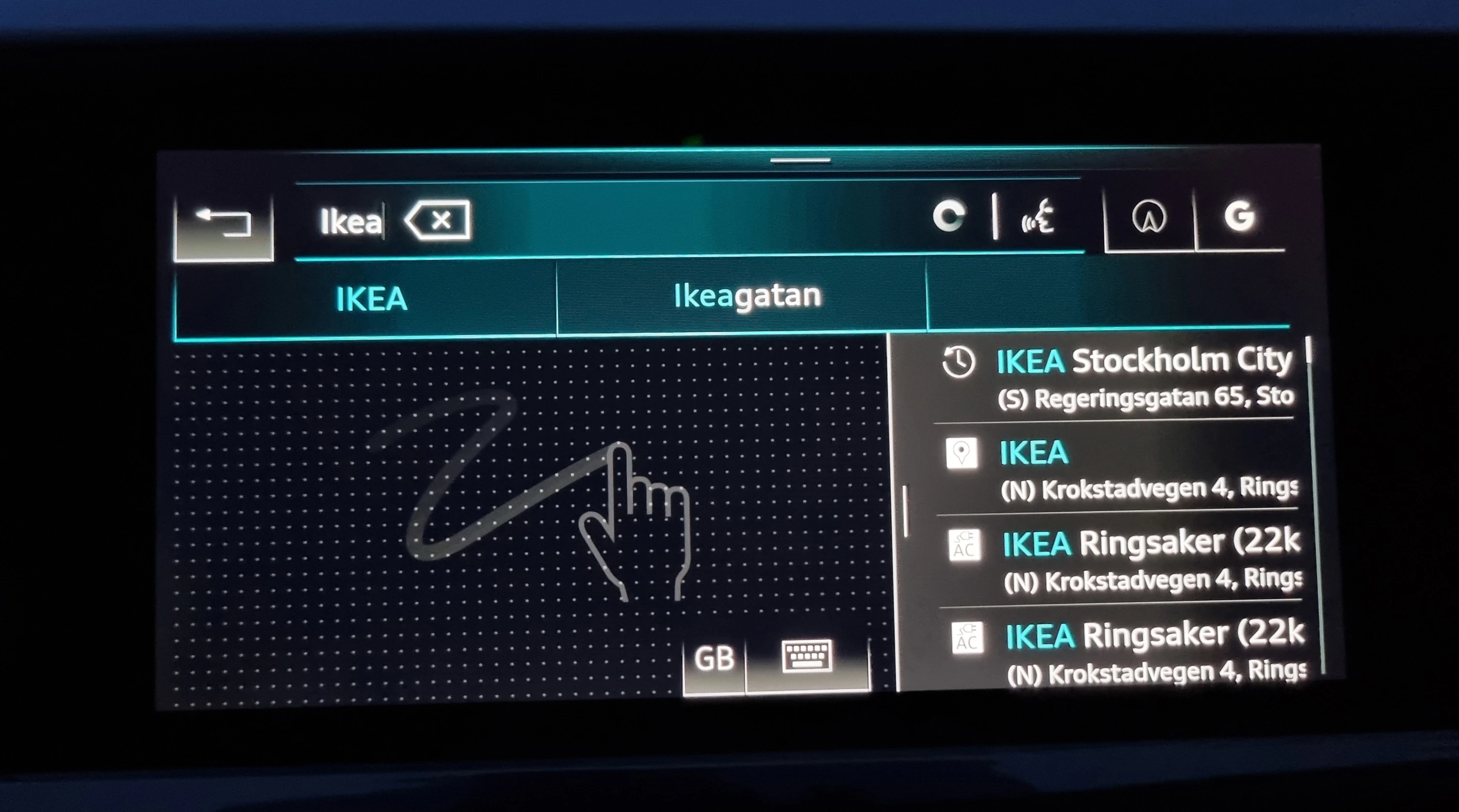 In the below set of images, you see how it is to search and create a route going to IKEA from the MMI system.