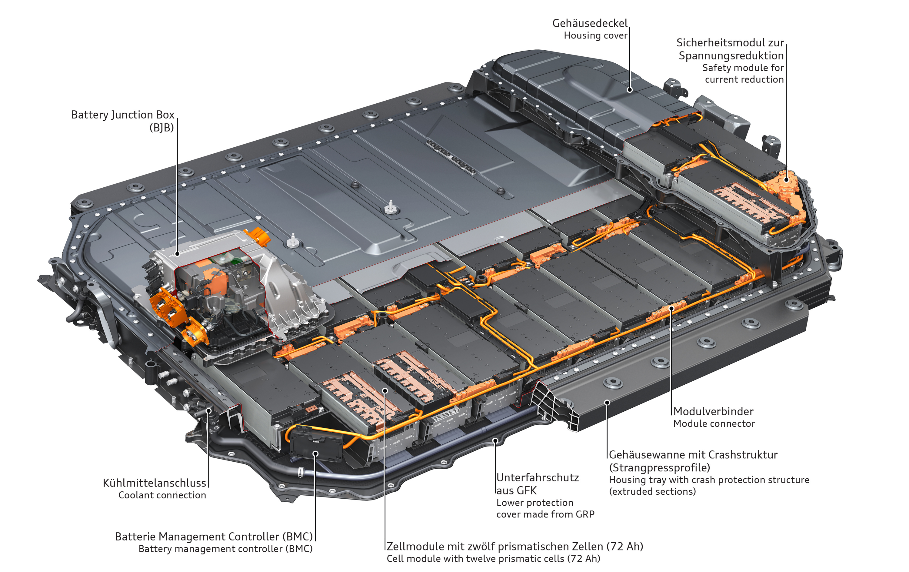 The battery junction box (BJB), into which the high-voltage relays and fuses are integrated, is the electrical interface to the vehicle. Enclosed in a die-cast aluminum housing, it is located in the front section of the battery system. Data exchange between the BMC, the CMCs, and the BJB is via a separate bus system.
