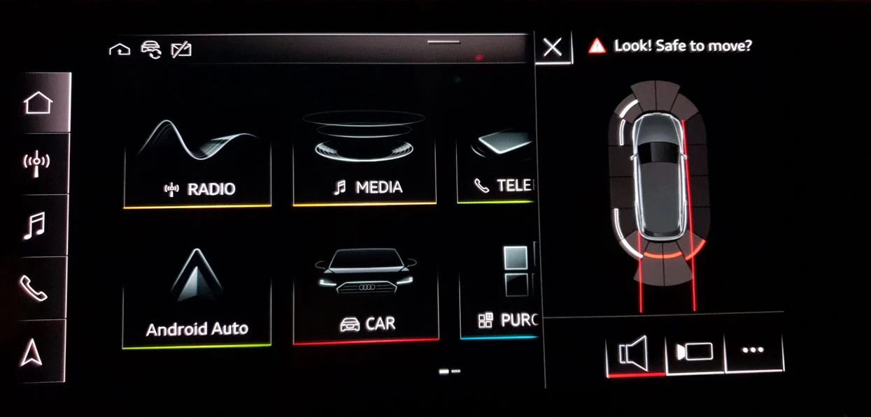 Audi Q8 e-tron is equipped with Maneuvering assist. Maneuvering assist recognizes moving and stationary objects larger than 10 centimeters (3.9 in), such as a pillar in a parking garage or a moving vehicle.