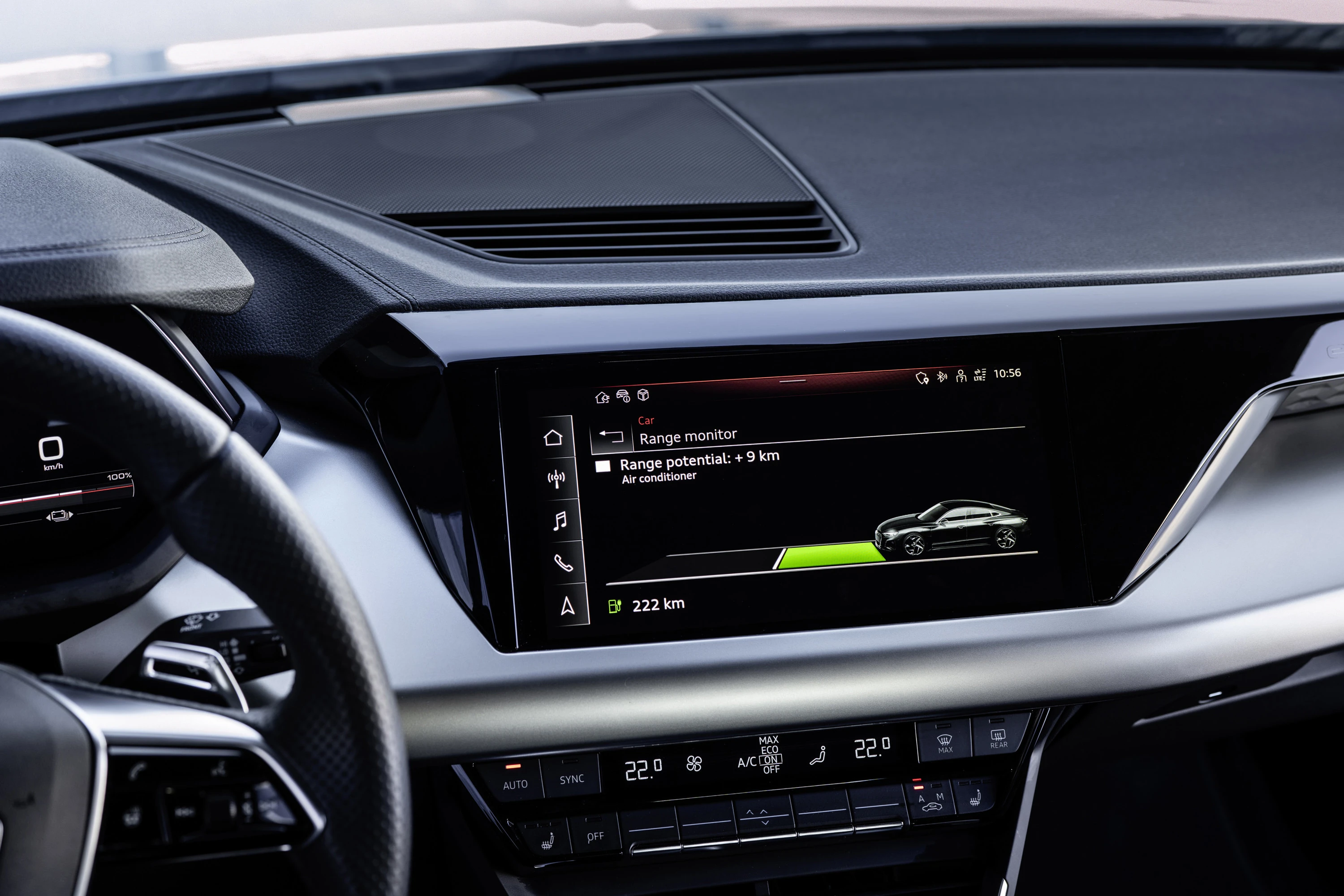Rekkeviddeprognosen er utledet fra høyspentbatteriets ladenivå og energiforbruksprognosen. Dette avhenger av flere faktorer. Drivsystemforbruket har størst effekt på det. Convenience-forbrukere og klimaanlegg har langt mindre effekt. For den anslåtte rekkevidden skiller Audi mellom to scenarier: den aktive navigasjonsruten og inaktiv navigasjon. For den aktive navigasjonsruten, anslått forbruk fra ruteprofilen (hastighetsgrenser, grønt lys, høydeforskjeller) og gjeldende trafikkinformasjon som kø samt gjennomsnittlig energiforbruk de siste 100 kilometerne (62,1 miles). I tillegg vurderes forventet bekvemmelighet og klimaforbruk for hele den kommende kjøreturen. Når navigasjonen er inaktiv, brukes gjennomsnittet av de siste 100 kilometerne (62,1 miles) for å bestemme drivsystemets forbruk. Det vurderes også bekvemmelighet og klimaforbruk. Ved å slå bekvemmelighetsforbrukere på og av via rekkeviddemonitoren, kan brukerne se deres direkte innvirkning på rekkeviddeprognosen.