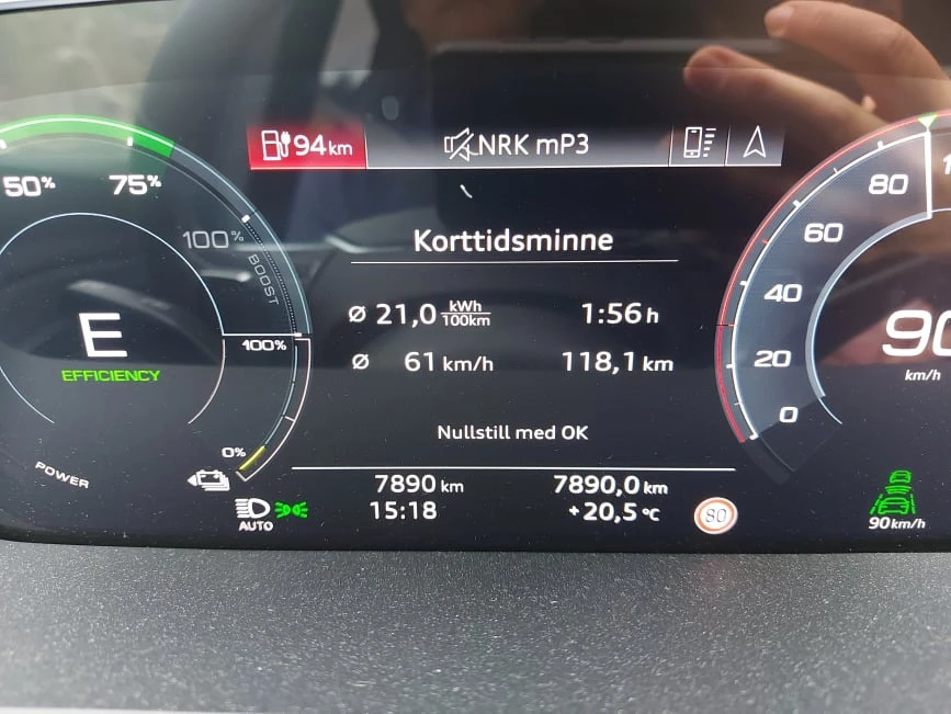 Her er bilen kjørt 118.1km med et forbruk på 21kWh/100km. Prosenten har gått ned fra 100% - 25%.