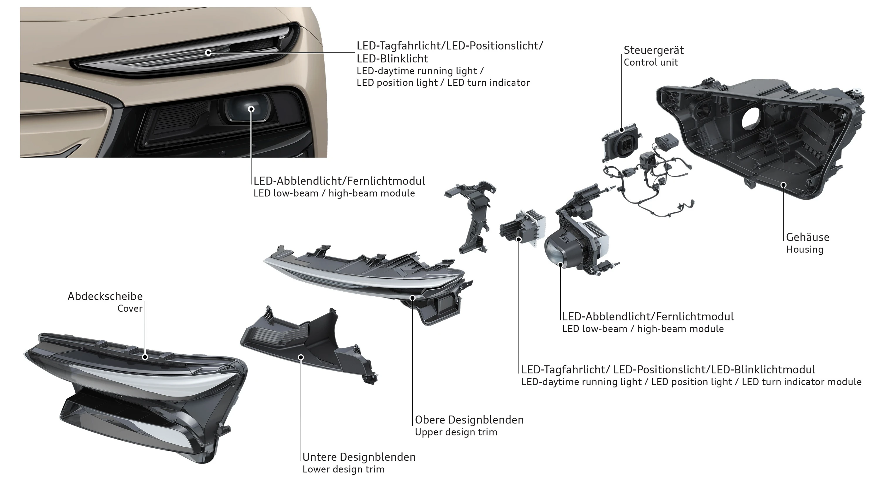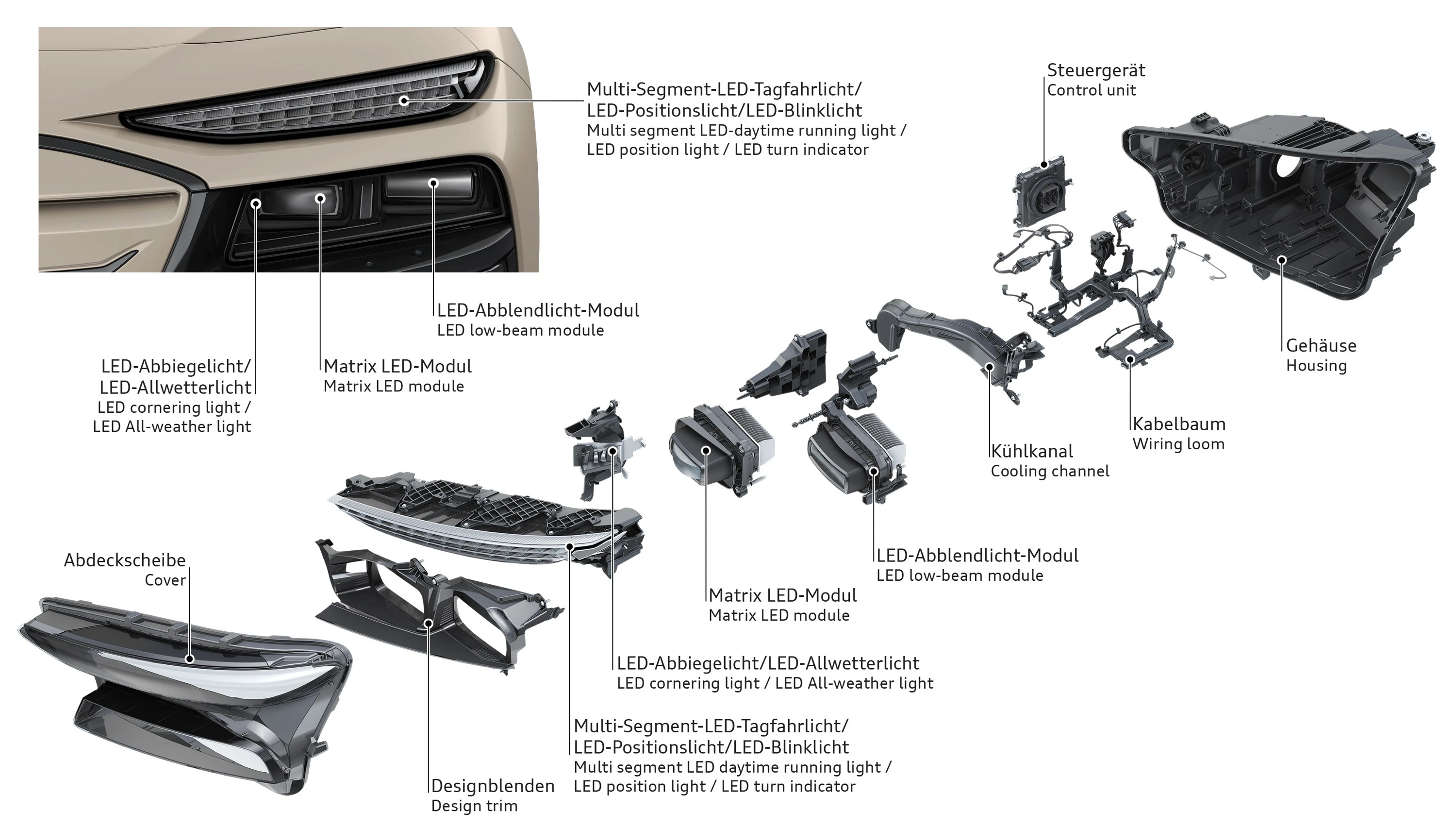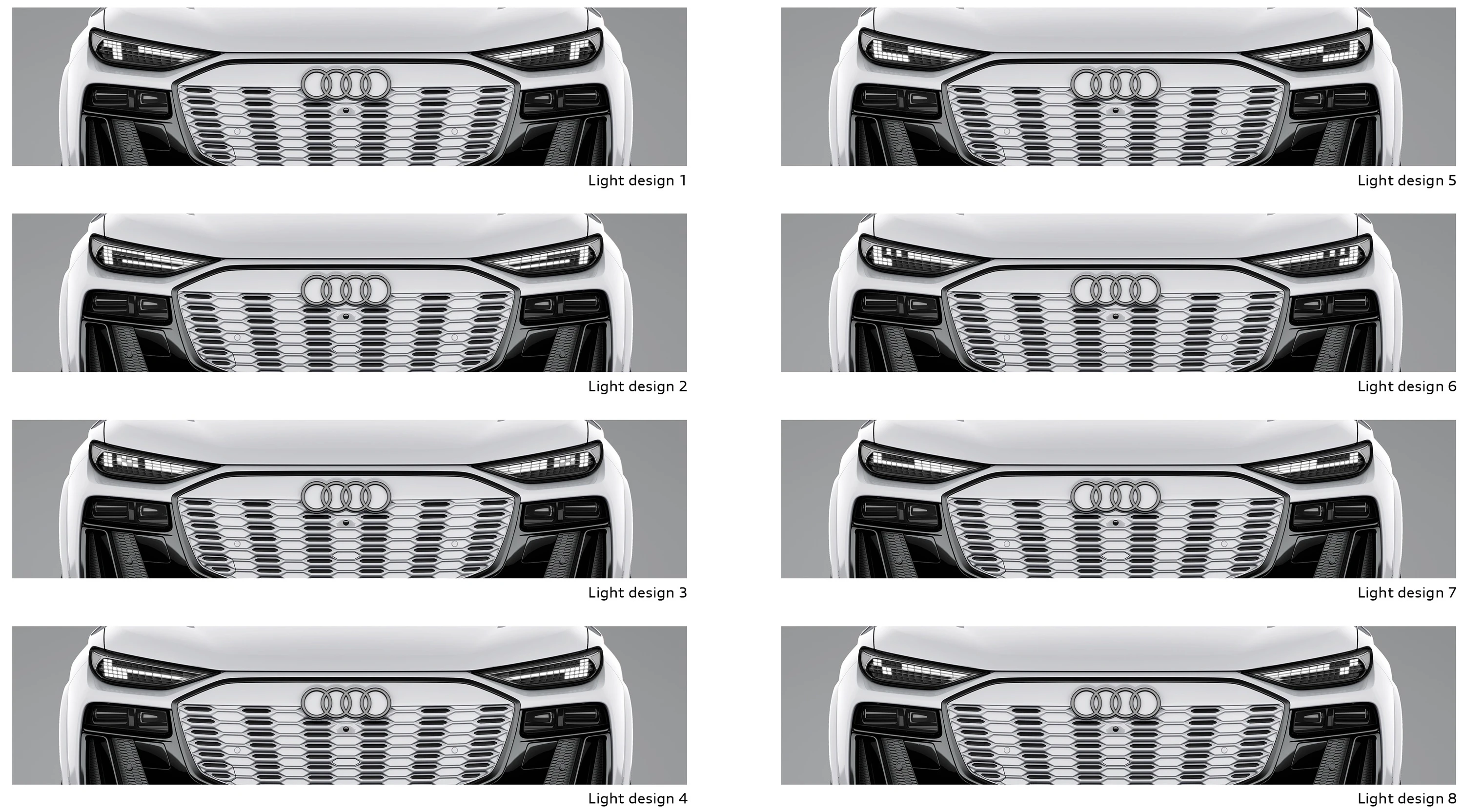 Audi fornyer også fronten på bilen. Den neste generasjonen av digitale kjørelys og lysmodulene er nå visuelt adskilte, noe som skaper større designklarhet. Designerne har designet de individuelle LED-ene – 70 totalt – i denne nye utviklingen av digitale kjørelys som transparente 3D-objekter. Den fremre delen av de digitale kjørelysene har en presis prismatisk struktur, mens en metallisert 3D-trim omgir dem for å trekke fokus til bilens digitale øyne.