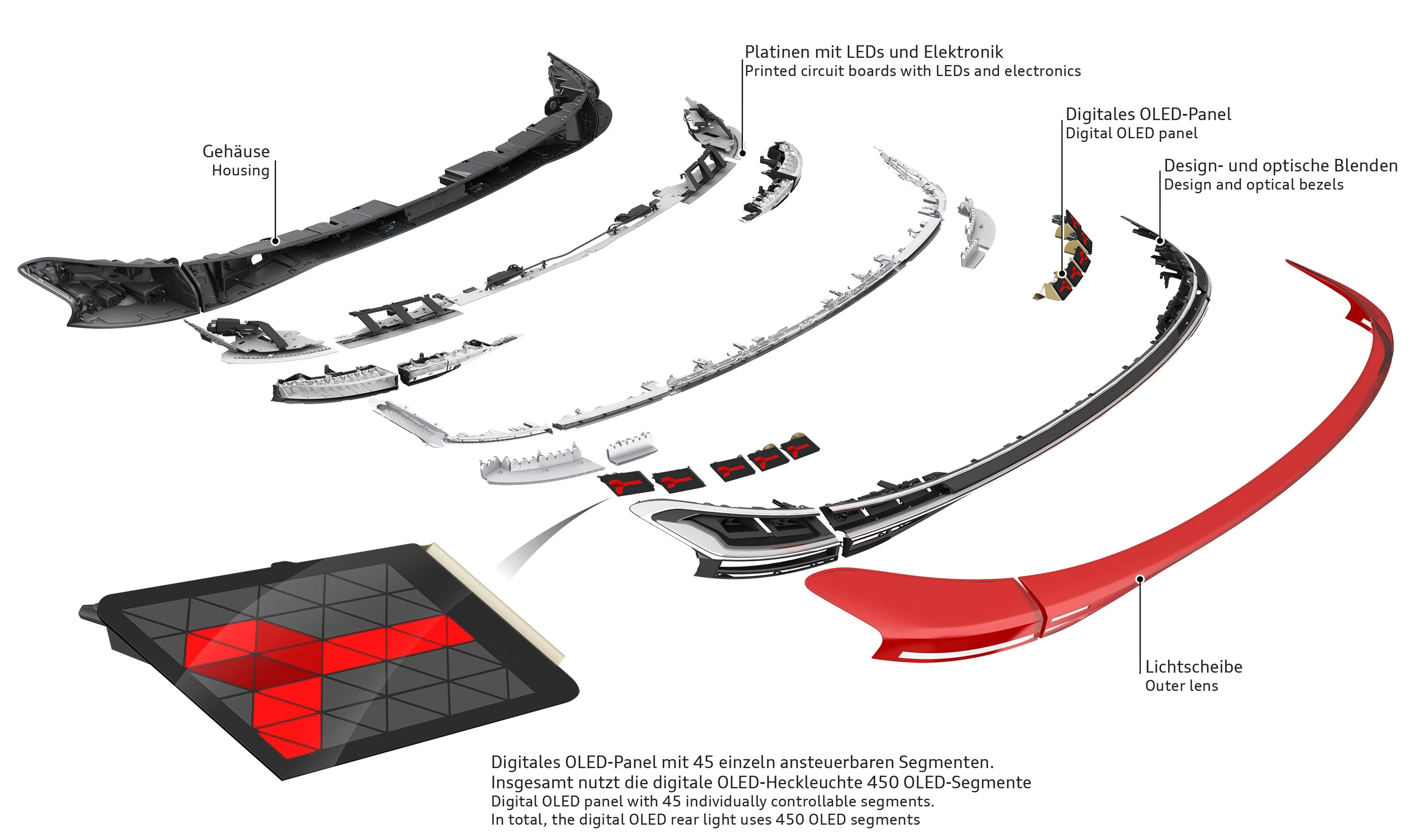 Den innovative digitale OLED-teknologien skaper forutsetninger for et helt nytt baklysdesign, som sikrer en unik homogenitet og svært høy kontrast. Det er andre fordeler: Overflatelyskilder krever ikke ekstra reflektorer, lysledere eller optikk, noe som gjør dem svært effektive. Sammen gjør disse egenskapene det mulig for Audis ingeniører og designere å bryte ned designgrensene mellom to- og tredimensjonalitet. Med andre ord, merket med de fire ringene skaper tredimensjonale former på todimensjonale overflater. I tillegg til en integrert, uttrykksfull LED-lyslist bak, skiller 3D-glass baklyset fra de andre lysfunksjonene.