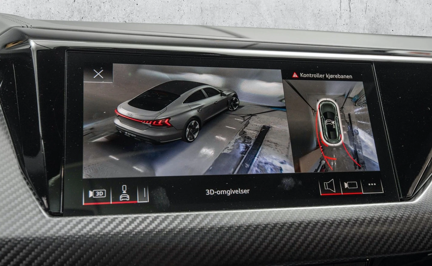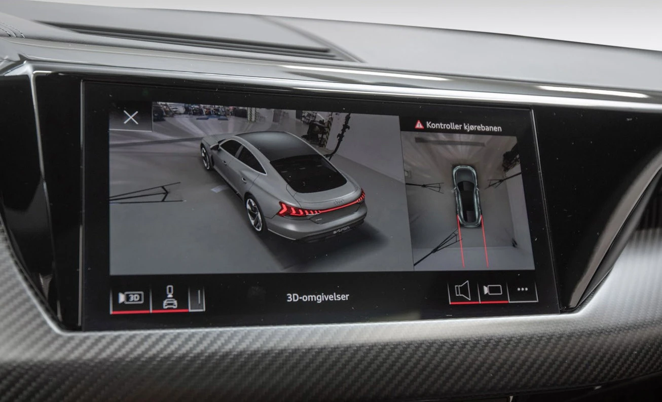 Audi e-tron GT kan leveres med 360 kamera. De fire 360 graders kameraene på Audi e-tron GT skanner umiddelbar nærhet og viser hindringer innenfor. Sjåfører kan velge mellom ulike visninger som forenkler parkering og manøvrering.