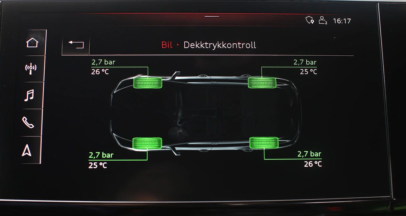 Med direkte TPMS er det en lufttrykksensor i hvert dekk som kommuniserer med bilen. Denne måler temperaturen og trykket for hvert hjul og presenterer dette i MMI.
