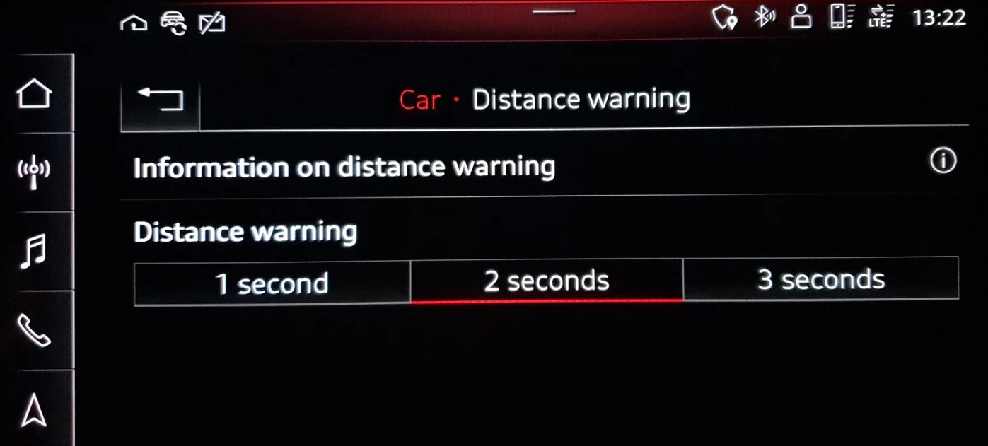 Audi e-tron er utstyrt med avstandsvarling. Avstandsvarslingen varsler deg når du kjører for nærme bilen foran deg.