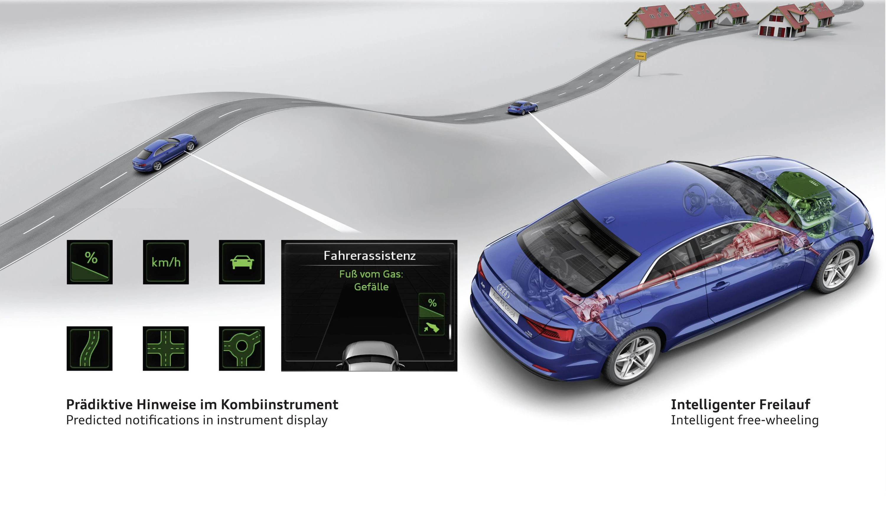 Føreren vises tilsvarende informasjon i instrumentgruppen eller i Audi virtual cockpit og head-up-displayet så snart det er fornuftig å ta foten av høyre pedal. Symboler for fartsgrenser, svinger, rundkjøringer, byer eller nedoverbakker som indikerer at sjåføren må bremse ned, vises på grunnlag av rutedata og gjenkjenning av trafikkskilt. Avhengig av modell pulserer gasspedalen også mot fotsålen til føreren – en klar indikasjon på å ta foten av gassen.