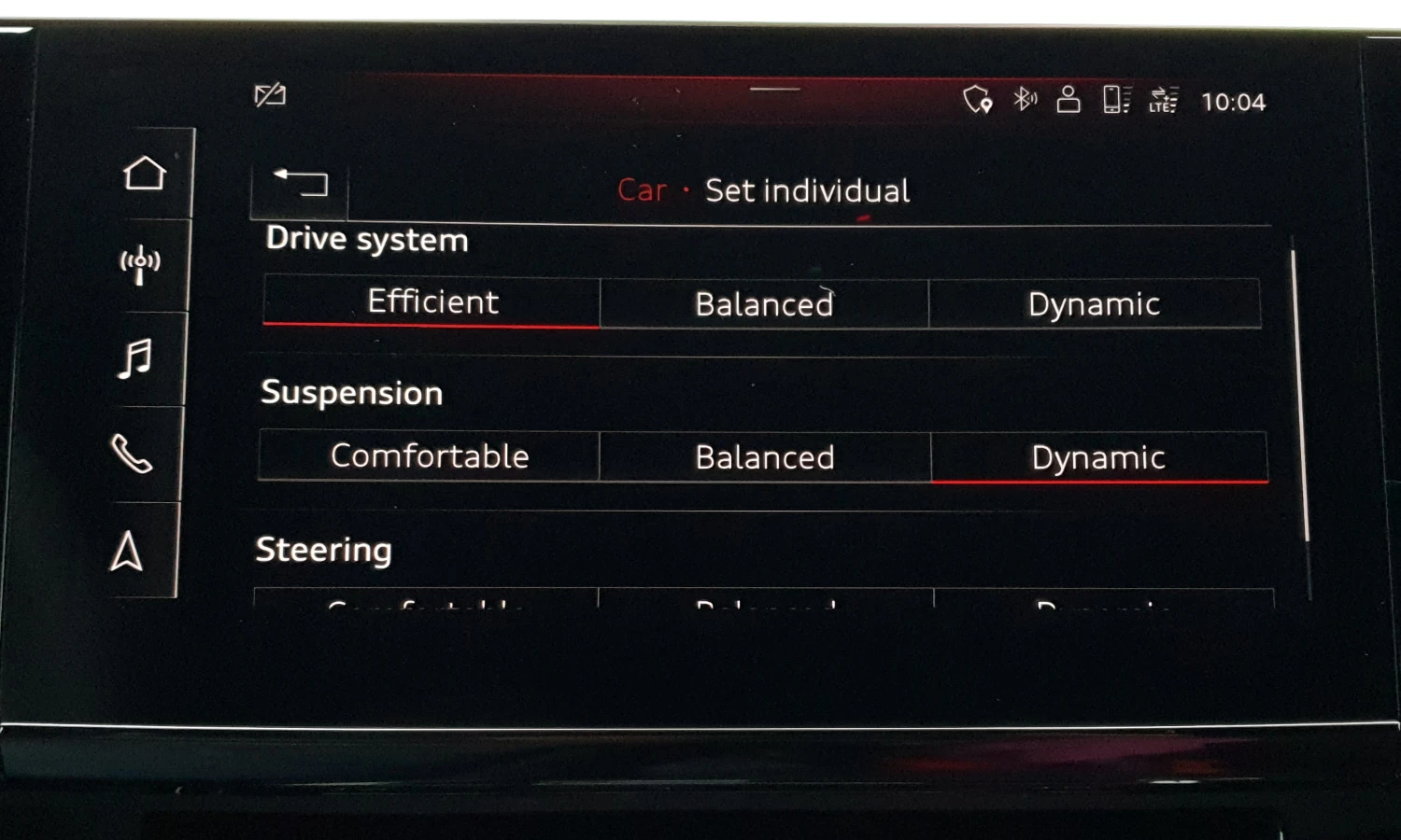 Audi drive select dynamisk håndteringssystem lar førere oppleve ulike oppsett i sin Audi e-tron. Å velge en av modusene auto, komfort, dynamisk eller effektivitet endrer karakteristikken til viktige driv- og fjæringskomponenter fra en komfortskjevhet til utpreget dynamisk eller spesielt energieffektiv.