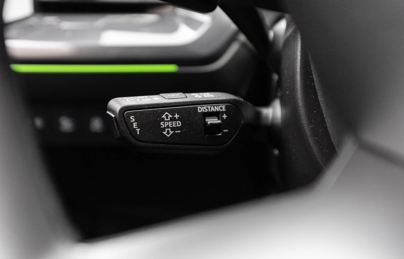 Cruisekontrollhåndtaket styrer funksjonen. Her kan man velge avstand til bil foran på Audi Q4 e-tron