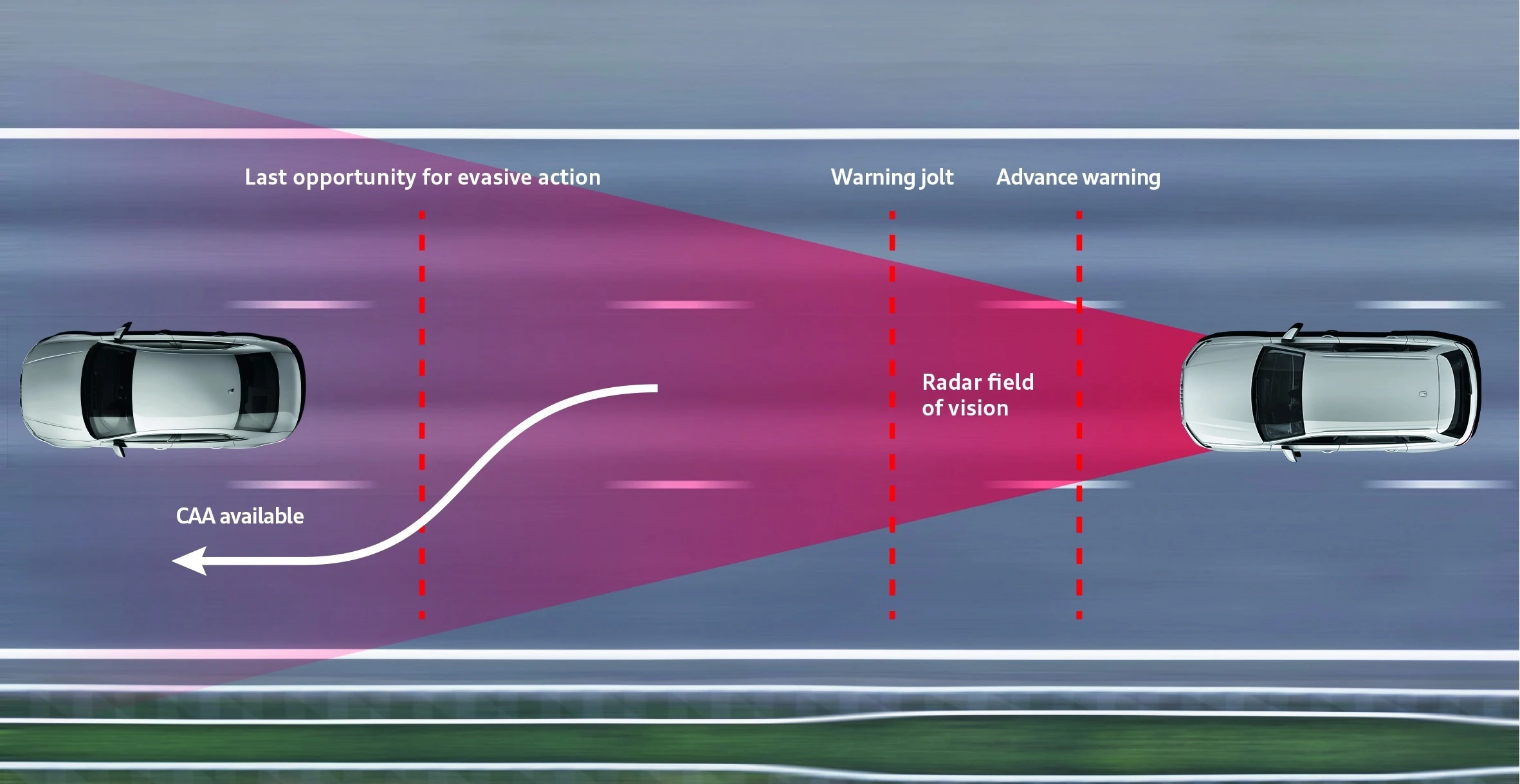 Systemet bruker data fra de to radarsensorene og frontkameraet til dette formålet. Ved beregning av en passende unnamanøverkorridor tar den hensyn til avstanden, bredden og forskyvningen til kjøretøyet som kjører foran. Kollisjonsunngåelsesassistent er tilgjengelig over et hastighetsområde fra ca. 30 til 150 km/t (18,6 til 93,2 mph), og det forutsetter at sjåføren aktivt styrer gjennom hele manøveren. Føreren informeres om inngrepet av en indikator i instrumentgruppen.