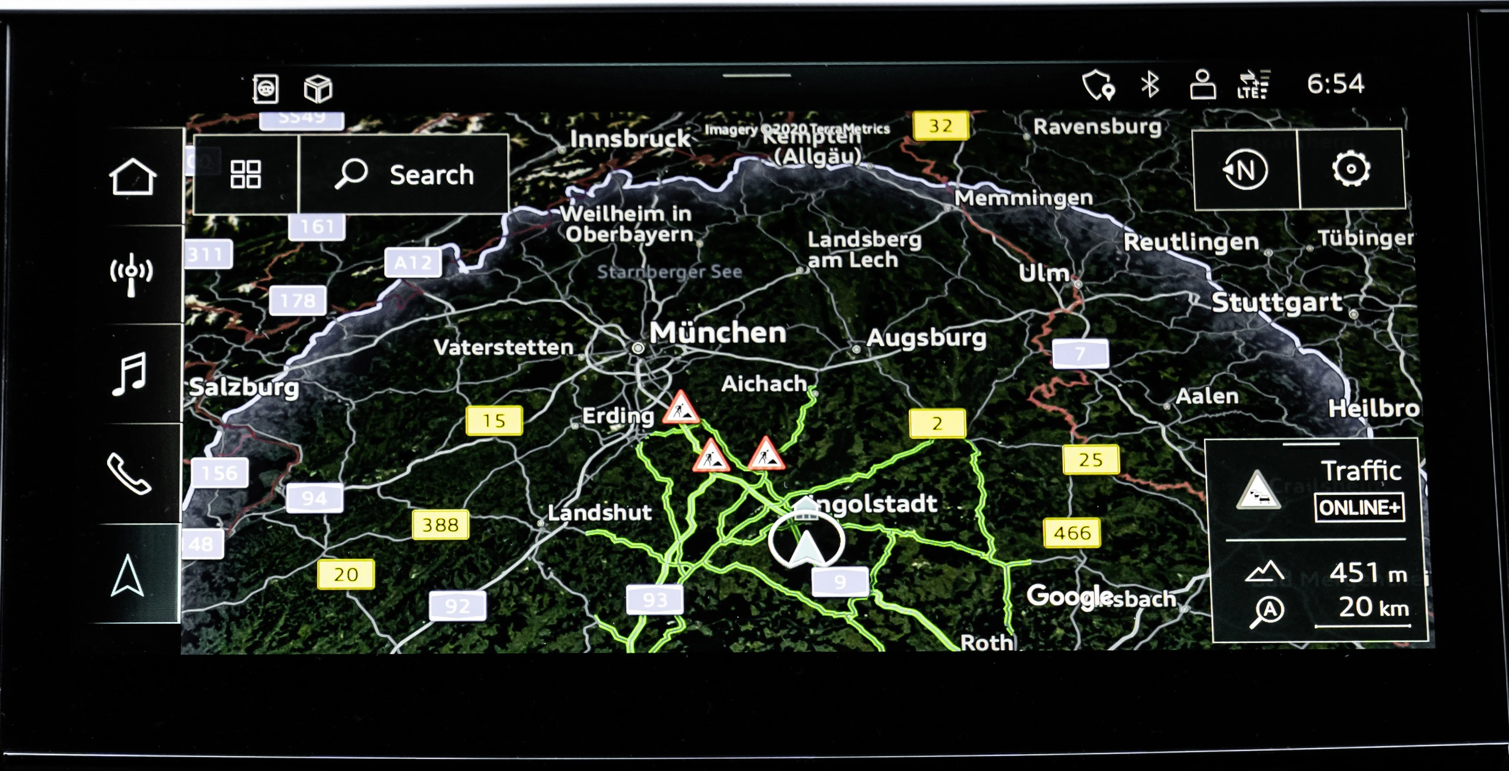 Navigasjonssystemet er tilgjengelig i virtual cockpit, Head up display og Audi MMi og vil hjelpe deg med å navigere til destinasjonen, men vil også hjelpe deg med å finne ladestasjoner, parkering og andre interessante steder langs ruten.