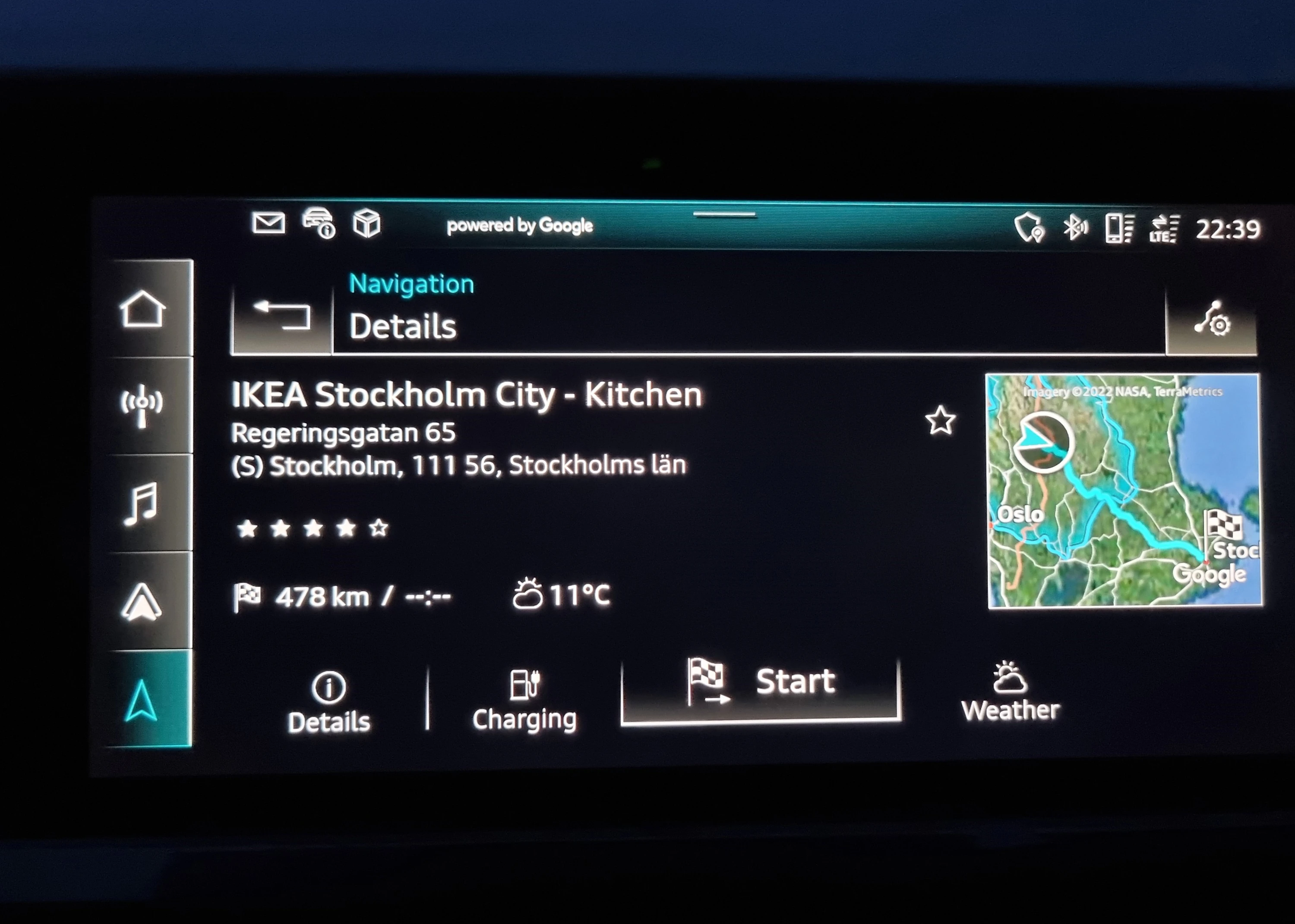 Trinn 3: Navigasjon informerer om at du ikke har nok lading ved å gå til IKEA og foreslår å legge til lading langs ruten