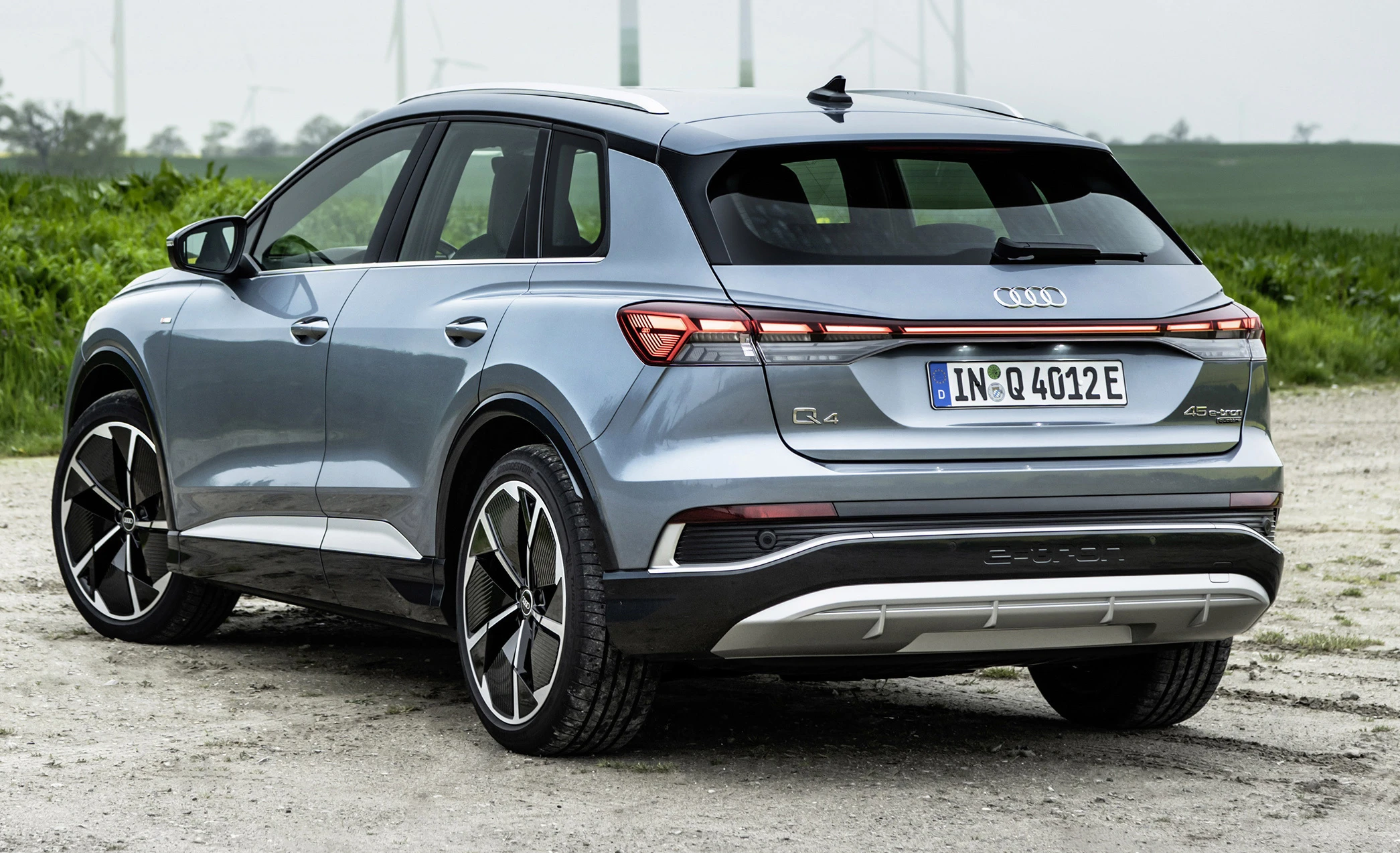 Audi Q4 45 e-tron quattro er inngangsmodellen med det største batteriet og quattro. 82 kWh batteri med 76,6 kWh tilgjengelig og WLTP-rekkevidde mellom 412-490km avhengig av utstyrsutstyr. 265Hk.