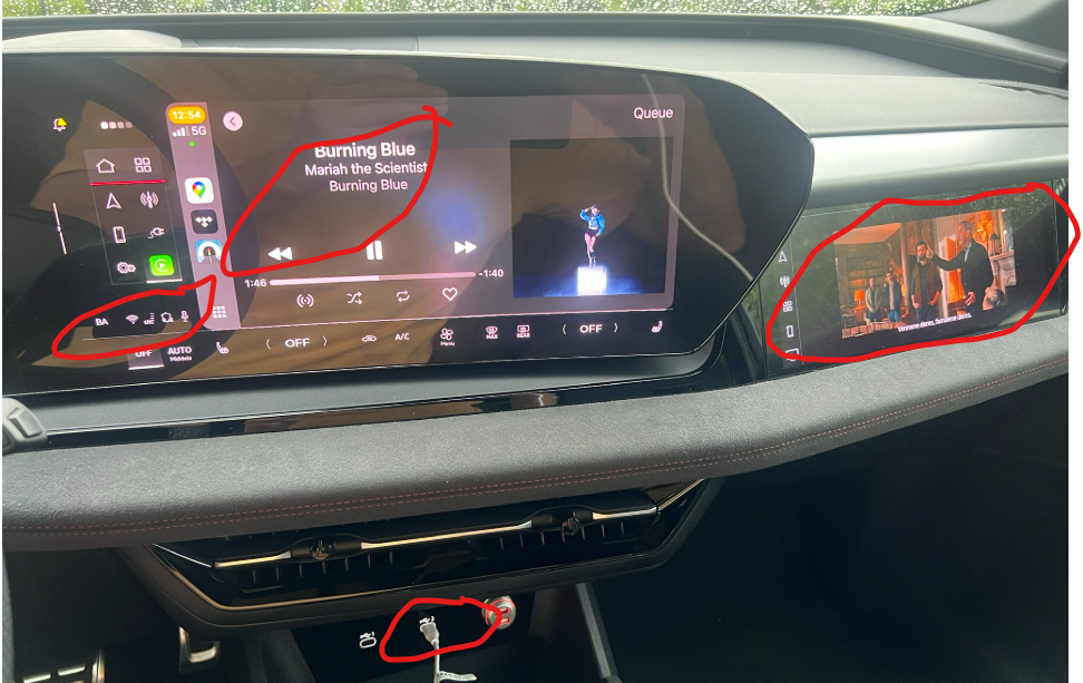 Her spilles TIDAL i CarPlay og det streames en film i Vivaldi. Man kan ikke spille lyd samtidig (amatørmessig av Audi som ikke har åpnet for egen lydsone til f.eks headset for passasjerer), men man kan veksle mellom dette og hele tiden bruke data fra mobilen