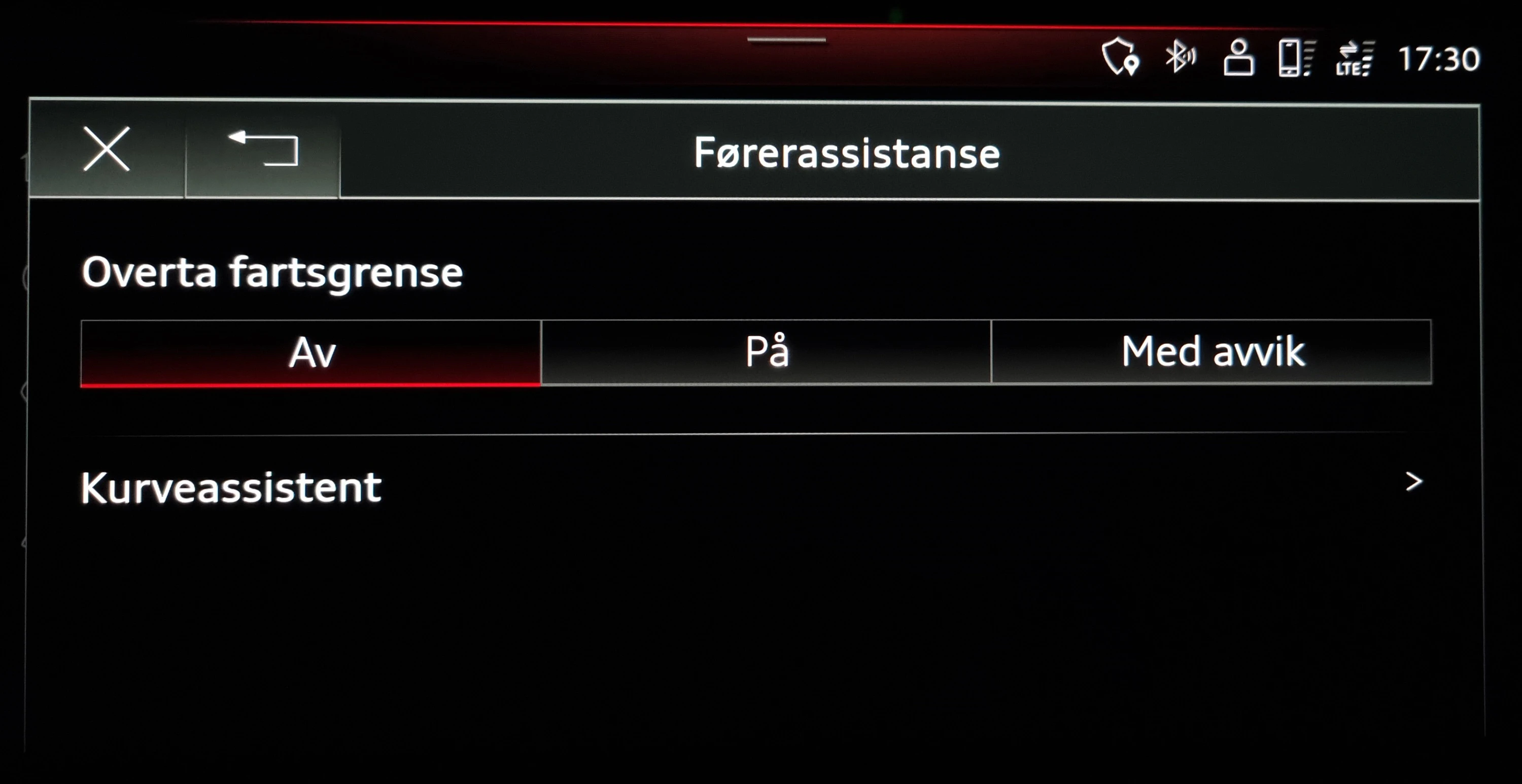 Velg -> Bil -> Førerassistent -> Adativ kjøreassistent -> Prediktiv kontroll -> Overta fartsgrense -> Av