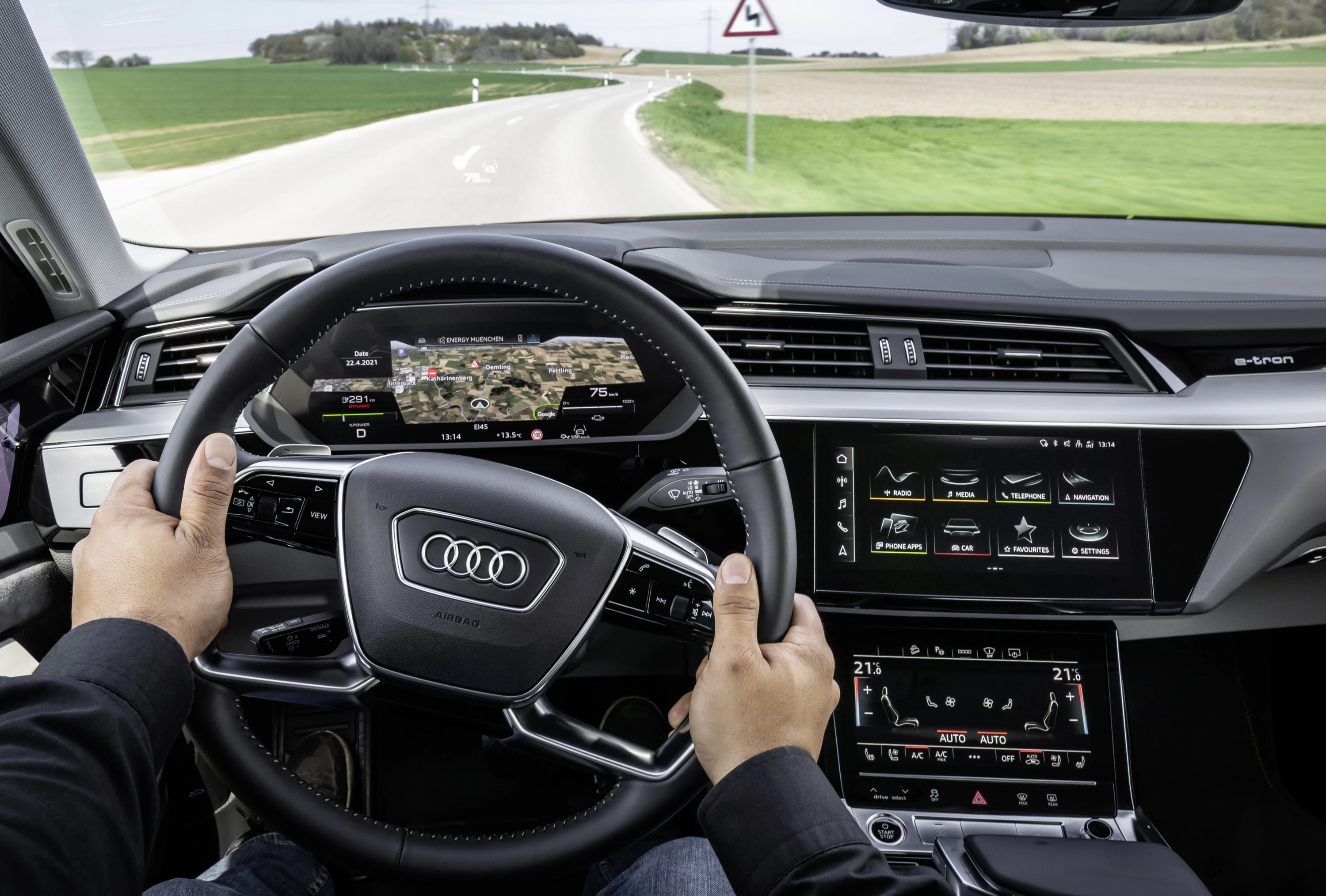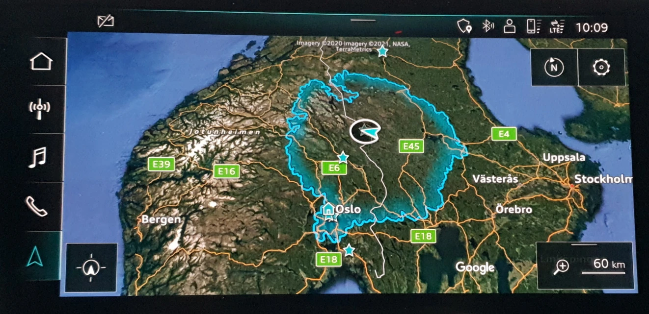 e-tron-ruteplanleggeren beregner den raskeste ruten, tar hensyn til trafikk- og veidata, inkluderer førerens kjørestil, beregner varigheten av ladestoppene og tar med dem i planleggingen av den totale reisetiden.