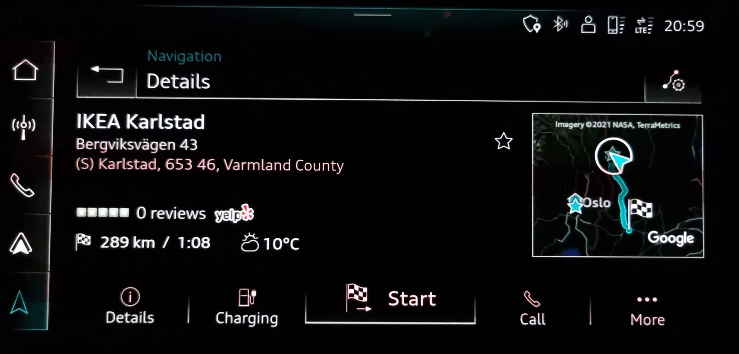 Trinn 3: Navigasjon informerer om at du ikke har nok lading ved å gå til IKEA og foreslår å legge til lading langs ruten